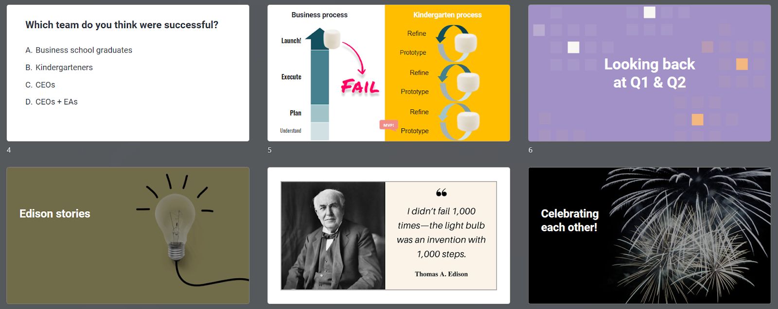 For one of my team’s offsites, our objective was to review performance over the past 6 months and plan for the rest of the year. However, in the last quarter, half of my team - who were new - had shown signs of being uncomfortable making mistakes. To address this, we kicked off with "Edison Stories," celebrating instances where we encountered failure, swiftly learned from it, and implemented solutions - emphasising our team's belief in "fail fast, learn fast, and fix fast".